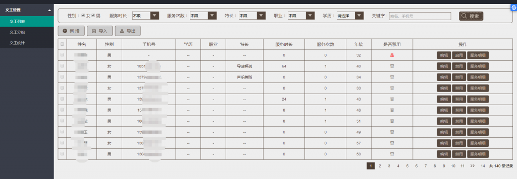 寺院管理軟件的義工管理功能包含義工列表,義工分組,義工統計,每個功能可以幫助寺院管理人員快速登記、查找和分析相關義工人員,工作安排可以通過微信信息直接促達,省時省力管理義工人員。