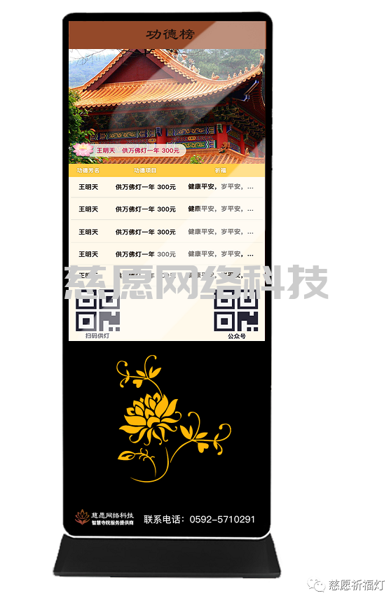 寺院捐贈系統(tǒng)中的供燈祈福模塊讓信眾通過微信公眾號、APP或觸摸屏、現(xiàn)場掃碼線上線下按天、按月、按年付費供燈,直播查看祈福信息。